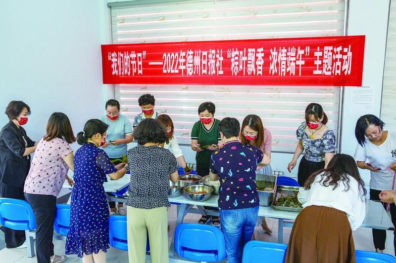 包粽子。6月1日,德州日报社举行“‘我们的节日’——2022年‘粽叶飘香 浓情端午’”主题活动,部分干部职工参加包粽子活动,感受浓浓的端午节日氛围。活动中,大家相互指导、相互学习,体验劳动乐趣,传递文明过节、健康生活的社会新风尚。