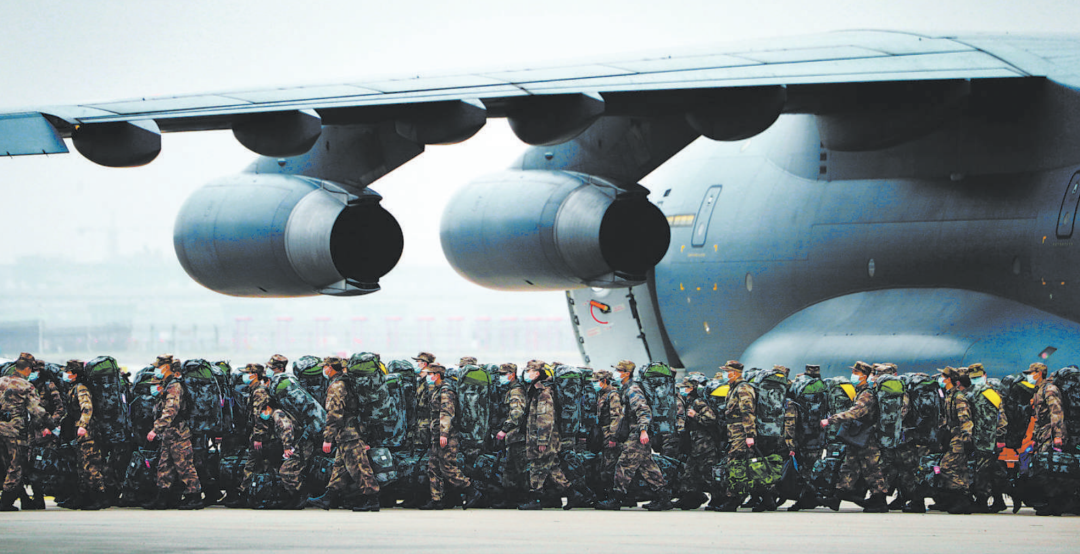 铁翼鲲鹏,紧急驰援。2020年2月13日,运-20运输机满载着又一批军队支援湖北医疗队队员和医疗物资,抵达武汉天河机场。首次参加非战争军事行动的运-20,见证了新时代人民军队一次举世瞩目的卫勤力量大集结——继除夕夜450多名“白衣战士”逆行江城之后,空军分别于2月2日、13日、17日,连续出动3批次27架大中型军用运输机,从沈阳、兰州、广州、南京、乌鲁木齐、西宁、天津、张家口、成都、重庆等机场起飞,向武汉空运军队医疗队员和前方急需物资。王传顺摄