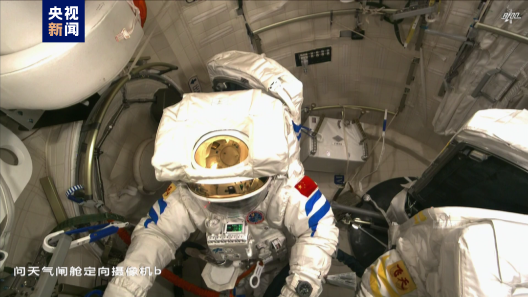 15时48分,航天员关闭问天舱段间舱门,随后航天员陈冬、刘洋先后进入舱外航天服,进行出舱前各项准备工作。