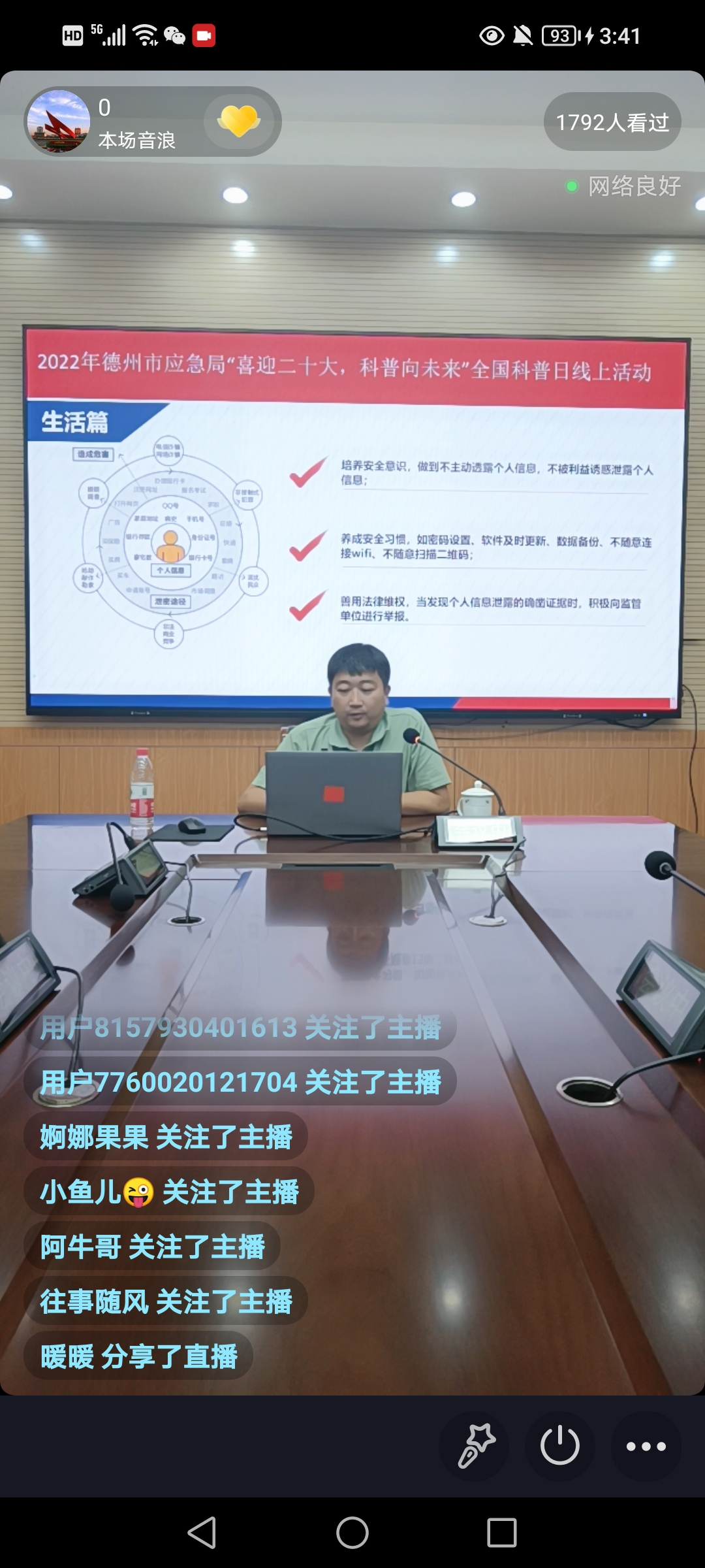为普及网络安全知识,提高广大群众的网络安全意识,9月16日,德州市应急局开展“喜迎二十大 科普向未来”全国科普日主题活动,邀请安恒信息技术有限公司网络安全工程师以“科普网络安全知识,弘扬网络文明风气”为题目,讲解了网络安全知识,并通过抖音平台面向全社会进行了线上直播。