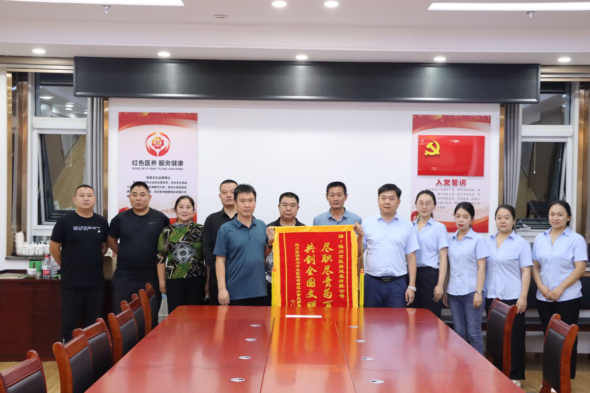 9月19日下午,德州市经济技术开发区长河街道办事处郭家痷社区书记曲安辉及社区工作人员一行七人,将一封感谢信及一面印有“尽职尽责为百姓 共创全国文明城”的锦旗送到德达集团医养健康公司,以此感谢公司对郭家庵社区的志愿帮扶工作。
