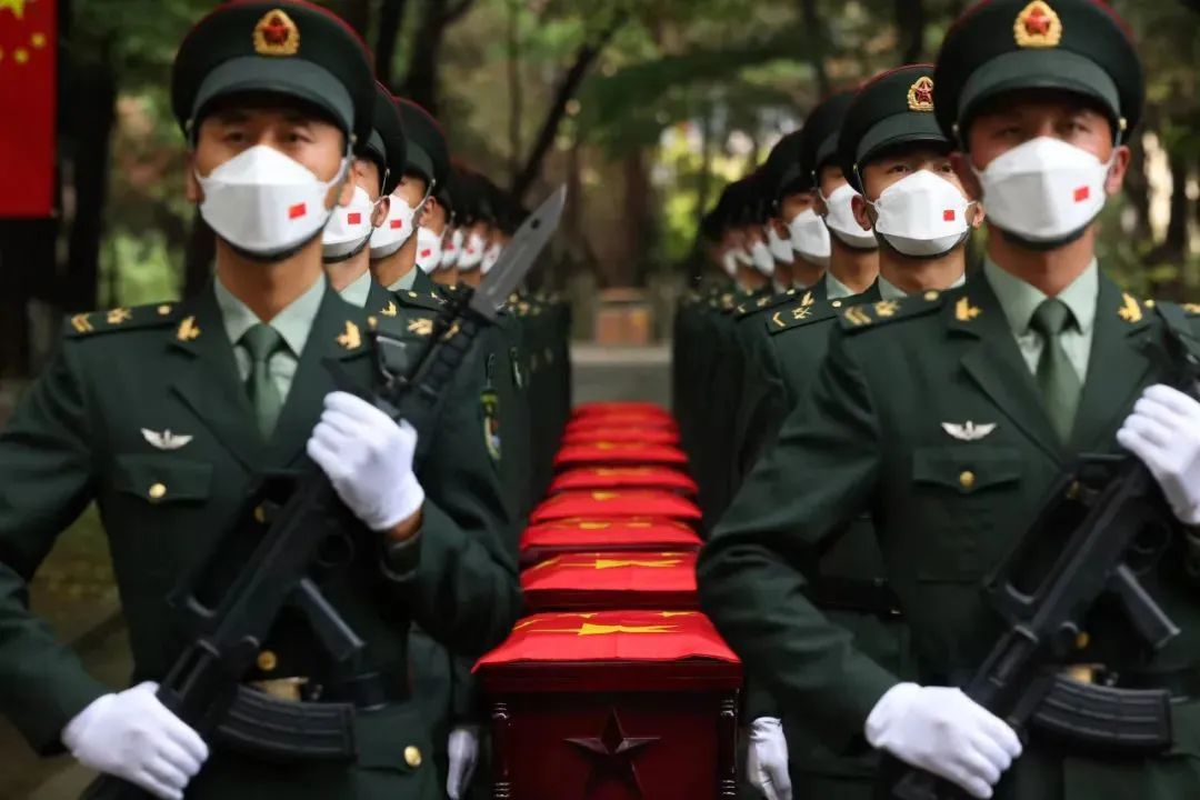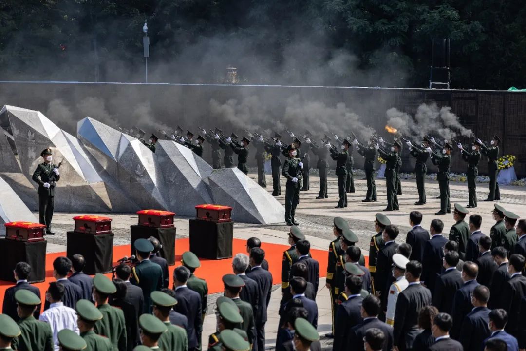 2022年9月17日上午,第九批在韩中国人民志愿军烈士遗骸安葬仪式,在沈阳抗美援朝烈士陵园举行。举行仪式的陵园下沉式纪念广场中央,环形烈士英名墙下摆满了黄白相间的菊花,寄托着人们的深切哀思。安葬仪式现场,参加仪式的人们排起长队,向烈士献花致敬,并瞻仰烈士英名墙。