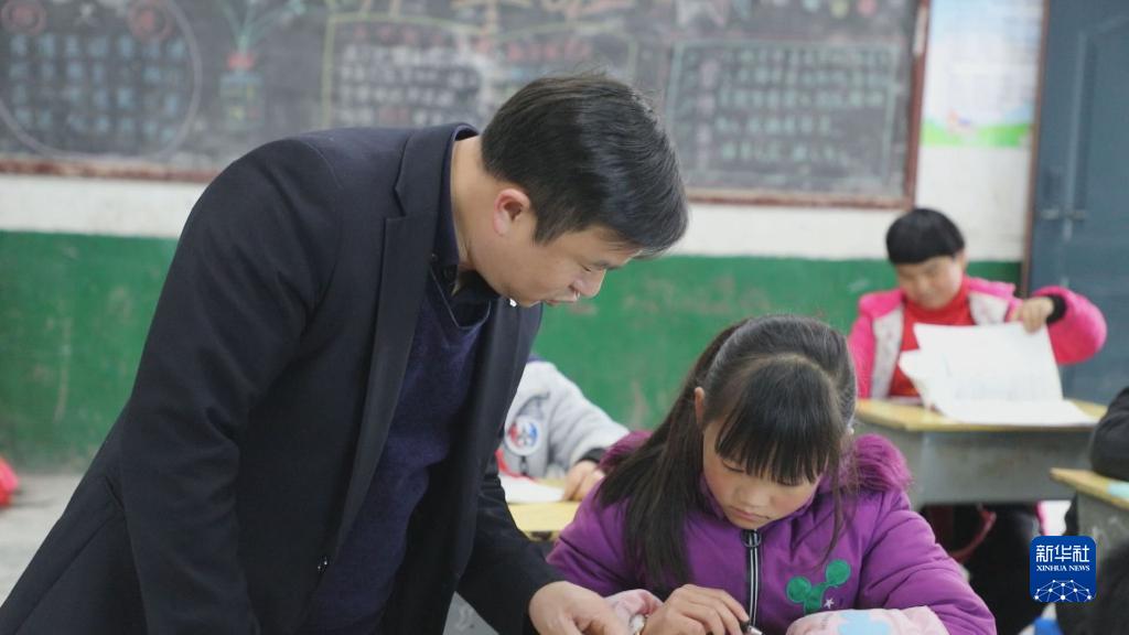 在湖南省常宁市塔山瑶族乡中心小学,盘玖仁在课堂上辅导学生(2021年11月25日摄)。新华社发(尹明 摄)