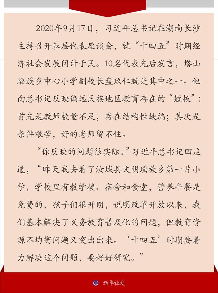 2020年9月17日,习近平总书记在湖南长沙主持召开基层代表座谈会,就“十四五”时期经济社会发展问计于民。10名代表先后发言,塔山瑶族乡中心小学副校长盘玖仁就是其中之一。他向总书记反映偏远民族地区教育存在的“短板”:首先是教师数量不足,存在结构性缺编;其次是条件艰苦,好的老师留不住。