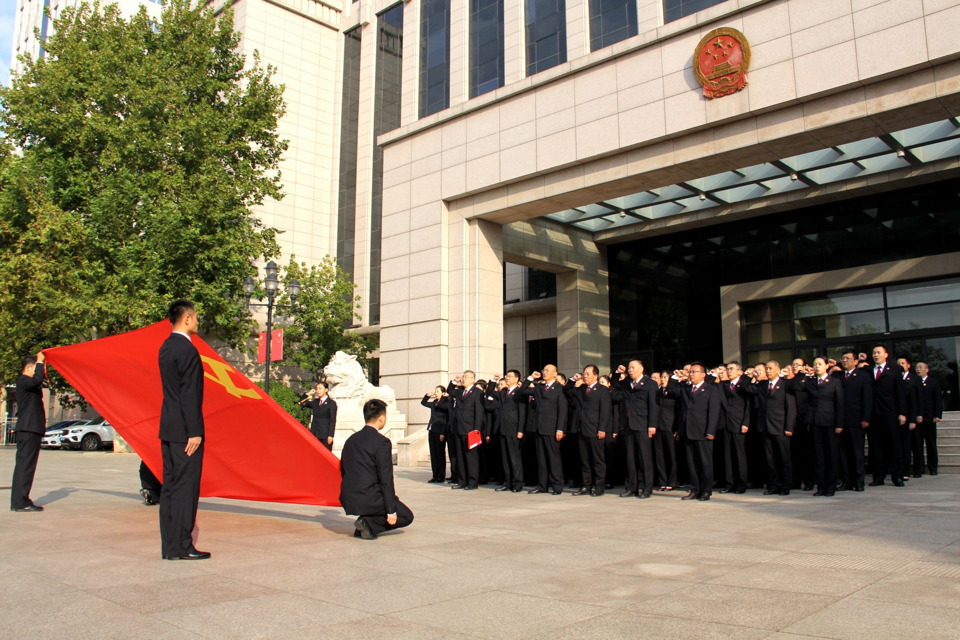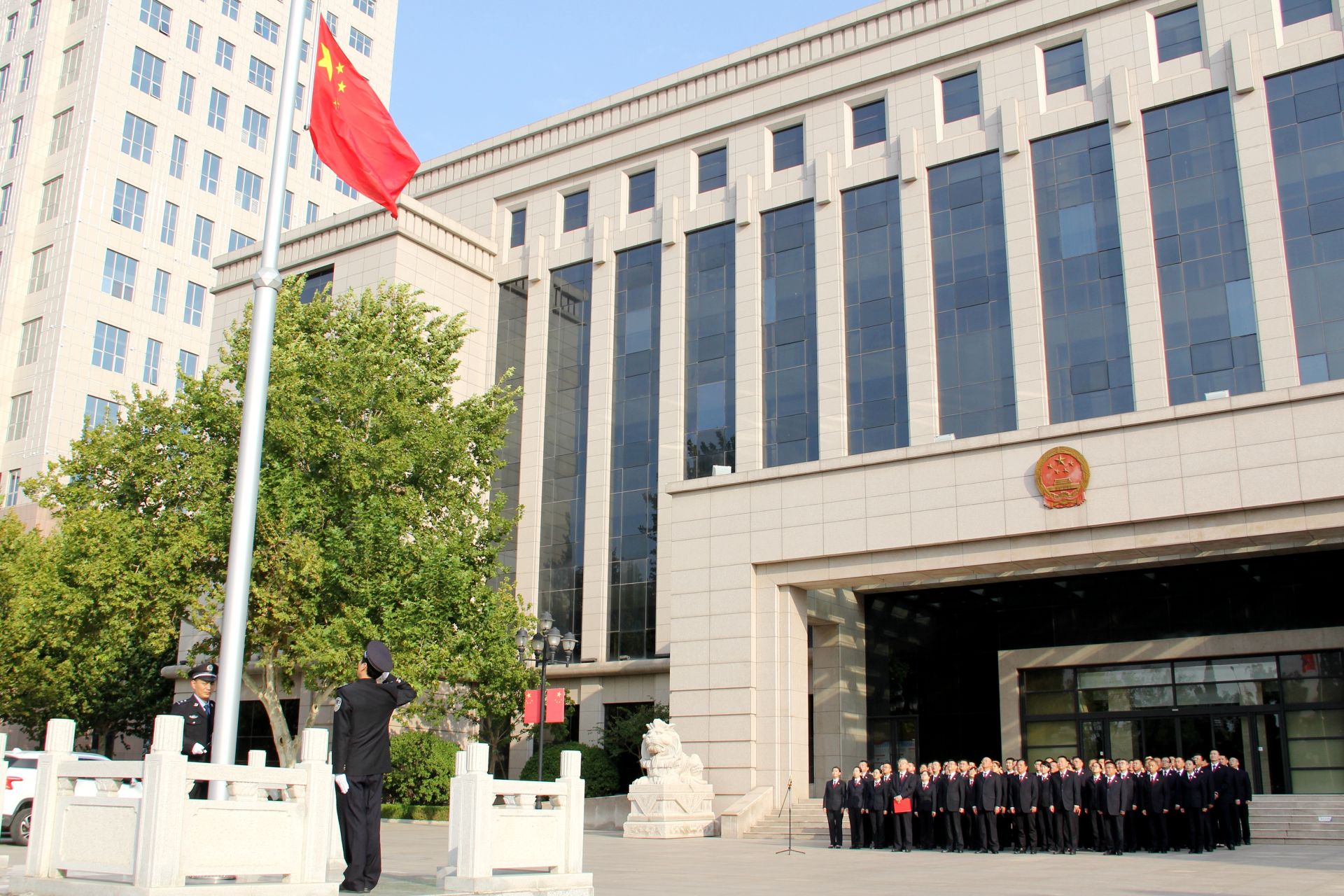 全体干警面向国旗行注目礼、高唱国歌,面向党旗高举右拳、庄严宣誓。