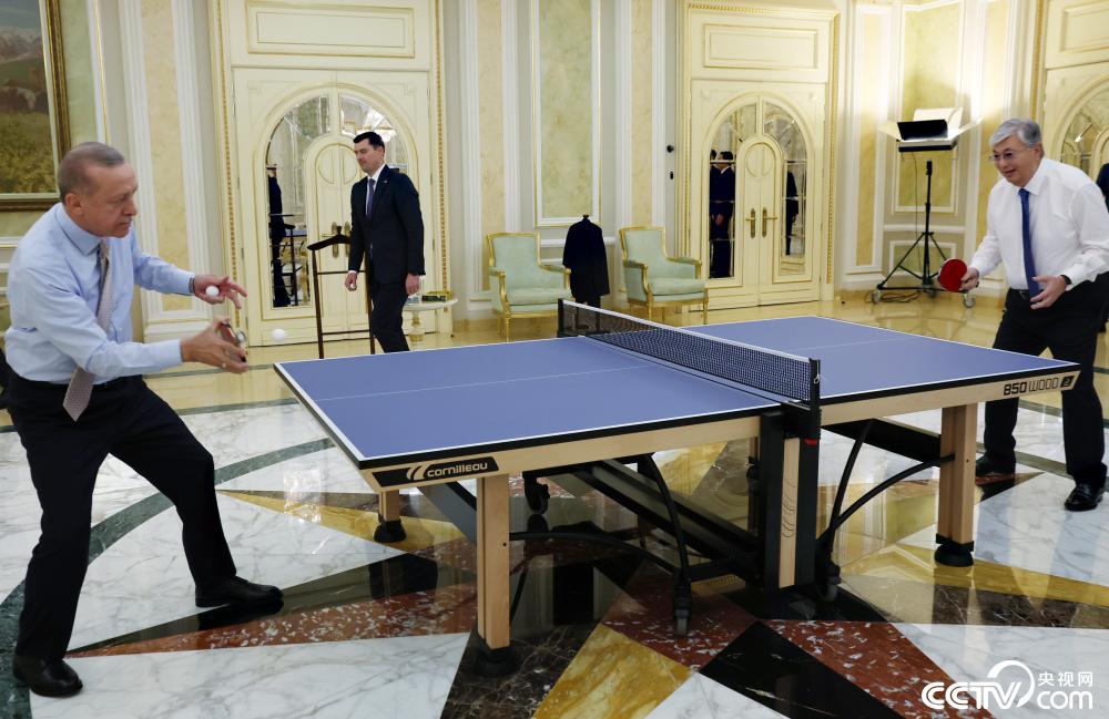 ▶ 埃尔多安访问哈萨克斯坦,与托卡耶夫打乒乓球。
