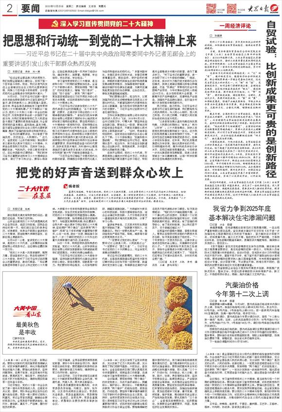 蓝图已经绘就,号角已经吹响。党的二十大胜利闭幕,山东出席党的二十大的代表们返回工作驻地后,纷纷走进基层、走进群众,以自己的亲身经历、切身感受,第一时间宣讲党的二十大精神,和干部群众一起学报告、谈体会、议发展、话落实,推动党的二十大作出的重大决策部署付诸行动、见诸成效。今天起,本报推出“二十大代表在基层”栏目,全面反映党的二十大精神在齐鲁大地落地落实的生动实践。敬请关注。