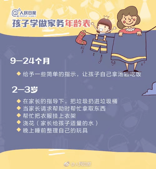 ▶ 【儿童家务年龄对照表,转给爸妈们!】有些爸妈在家什么都舍不得让孩子做,觉得只要好好读书就行。结果孩子一离家,处处难以自理。其实,做家务不仅能培养孩子的动手和自主能力,还能增强孩子的自信和责任感。不同年龄的孩子能做什么?怎样正确引导?儿童家务年龄对照表一起来看吧!