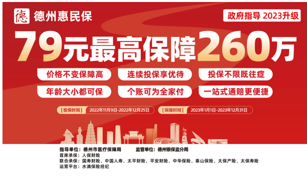 11月11日,2023年度德州专属城市定制型商业医疗保险“德州惠民保”正式上线,线上线下同步开启发售,产品79元/人/年,最高保障可达260万元。