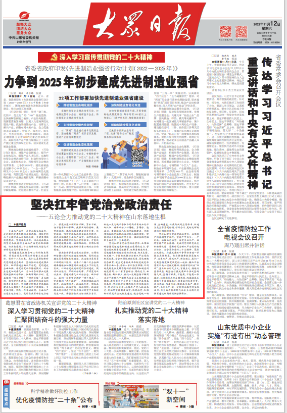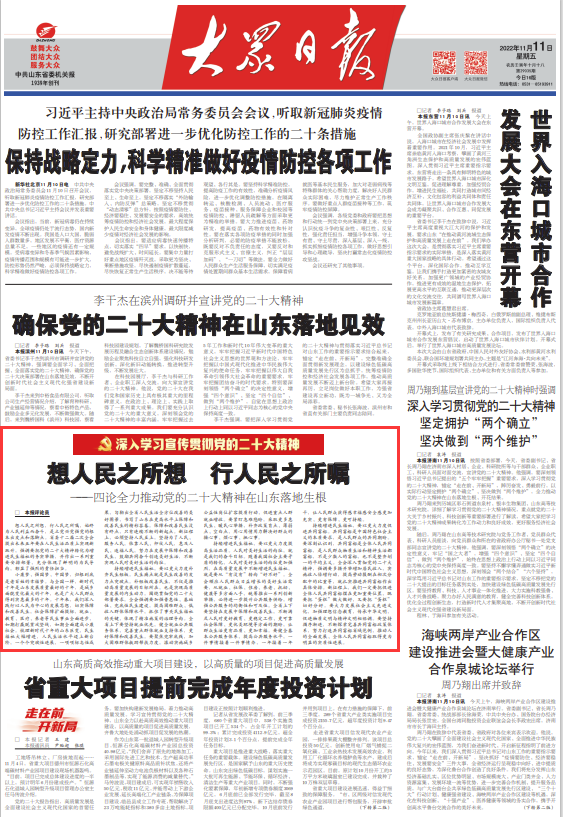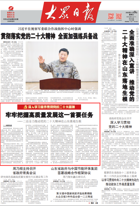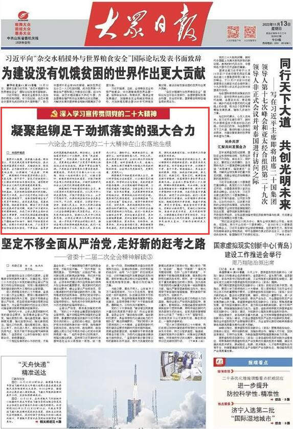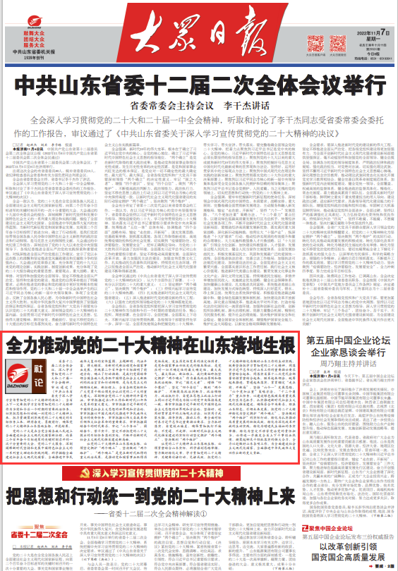 为激励全省广大党员干部群众,更加自觉地把思想和行动统一到党的二十大精神上来,切实把党的二十大精神转化为做好山东工作的生动实践,11月7日起,大众日报围绕“全力推动党的二十大精神在山东落地生根”推出社论一篇,系列评论六篇。