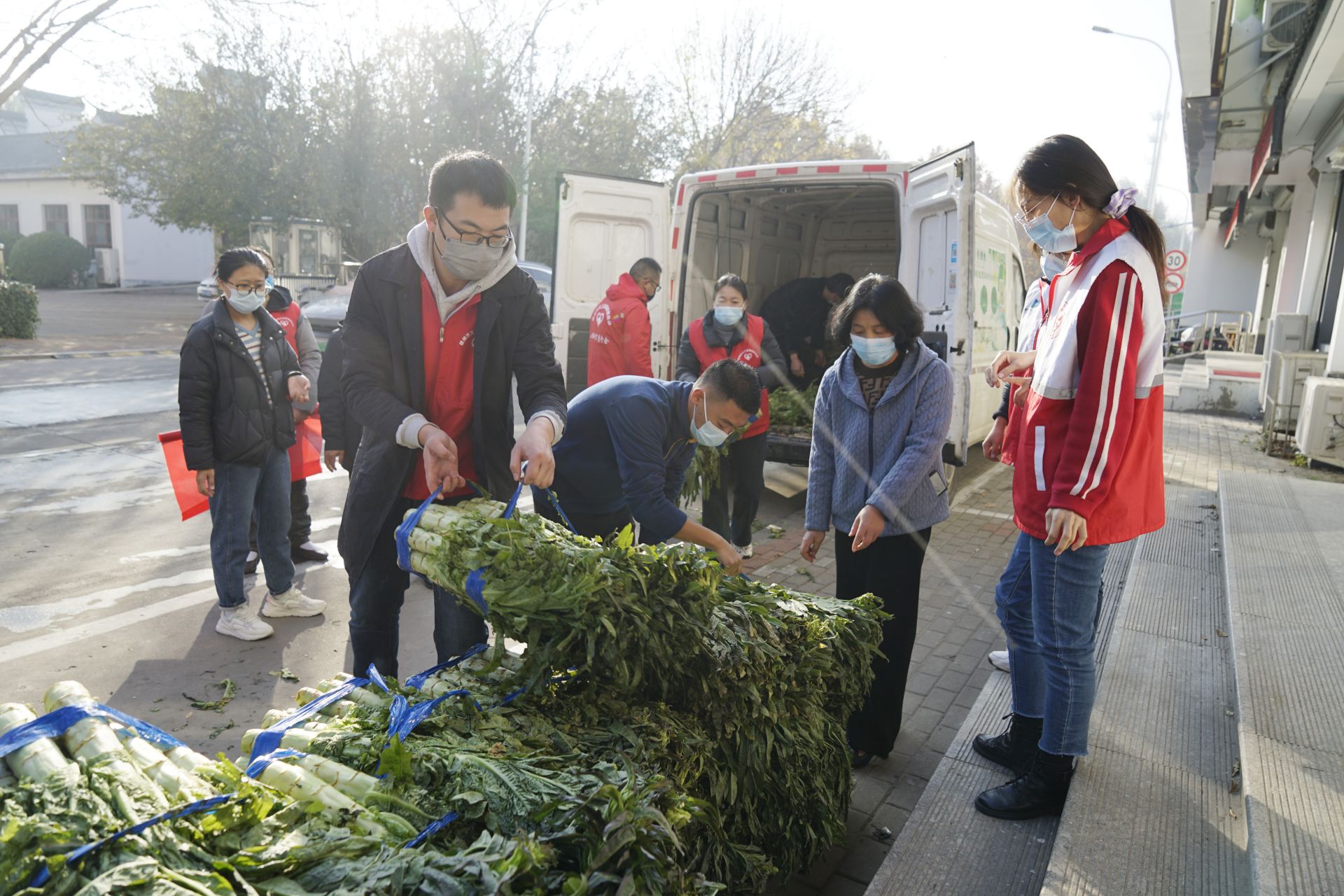 11月15日,德州日报社副总编辑、党委委员刘千山带领志愿者来到双报到社区新城社区,与德州市义工志愿者联合会紫云惠分会、春林分会一同将1500余斤莴苣、包菜、18件矿泉水等物资发放给一线防疫志愿者、社区独居老人等。