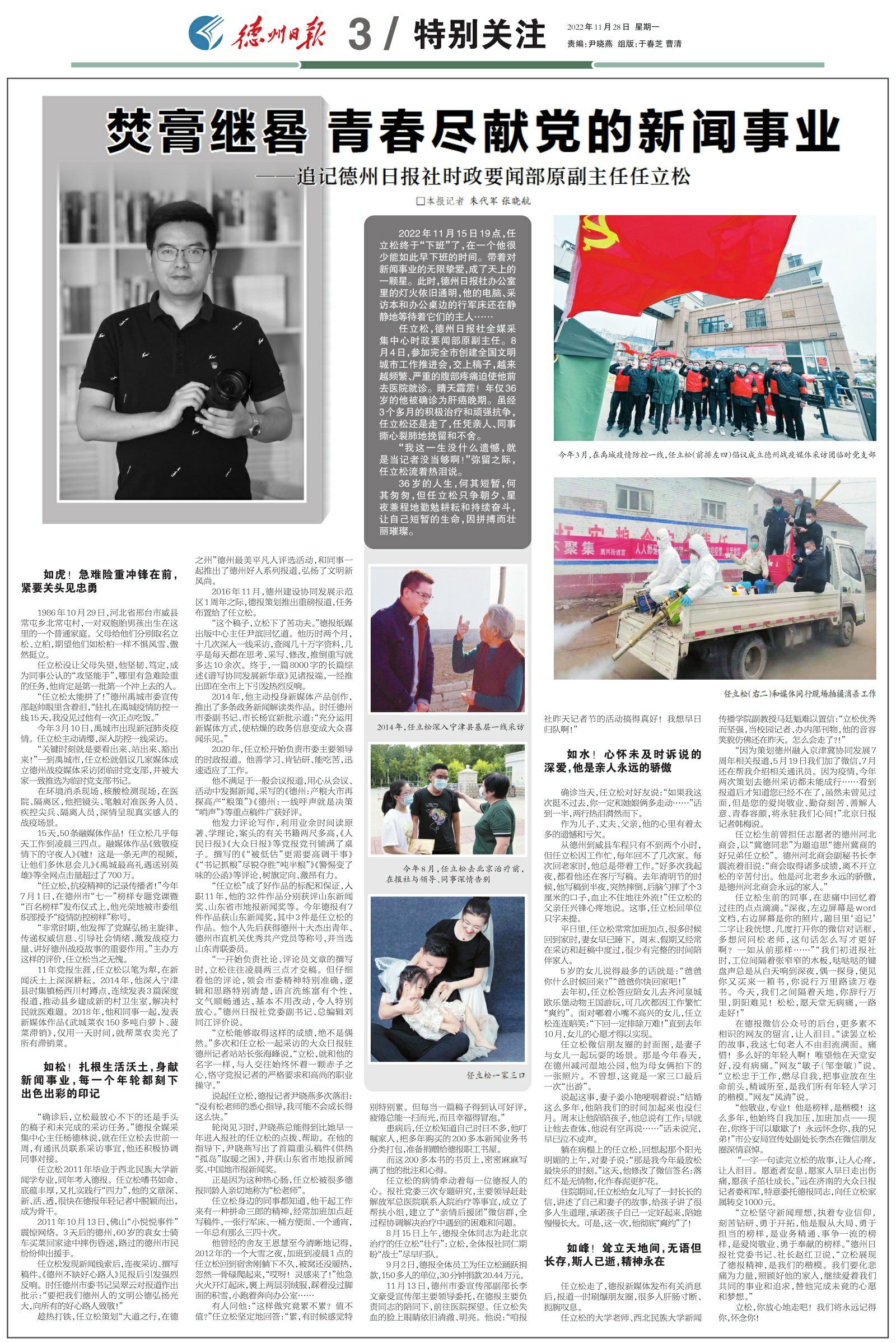 “立松坚守新闻理想,执着专业信仰,刻苦钻研、勇于开拓,他是服从大局、勇于担当的榜样,是业务精通、事争一流的榜样,是爱岗敬业、勇于奉献的榜样。”德州日报社党委书记、社长赵红卫说,“立松展现了德报精神,是我们的楷模。我们要化悲痛为力量,照顾好他的家人,继续爱着我们共同的事业和追求,替他完成未竟的心愿和梦想。”