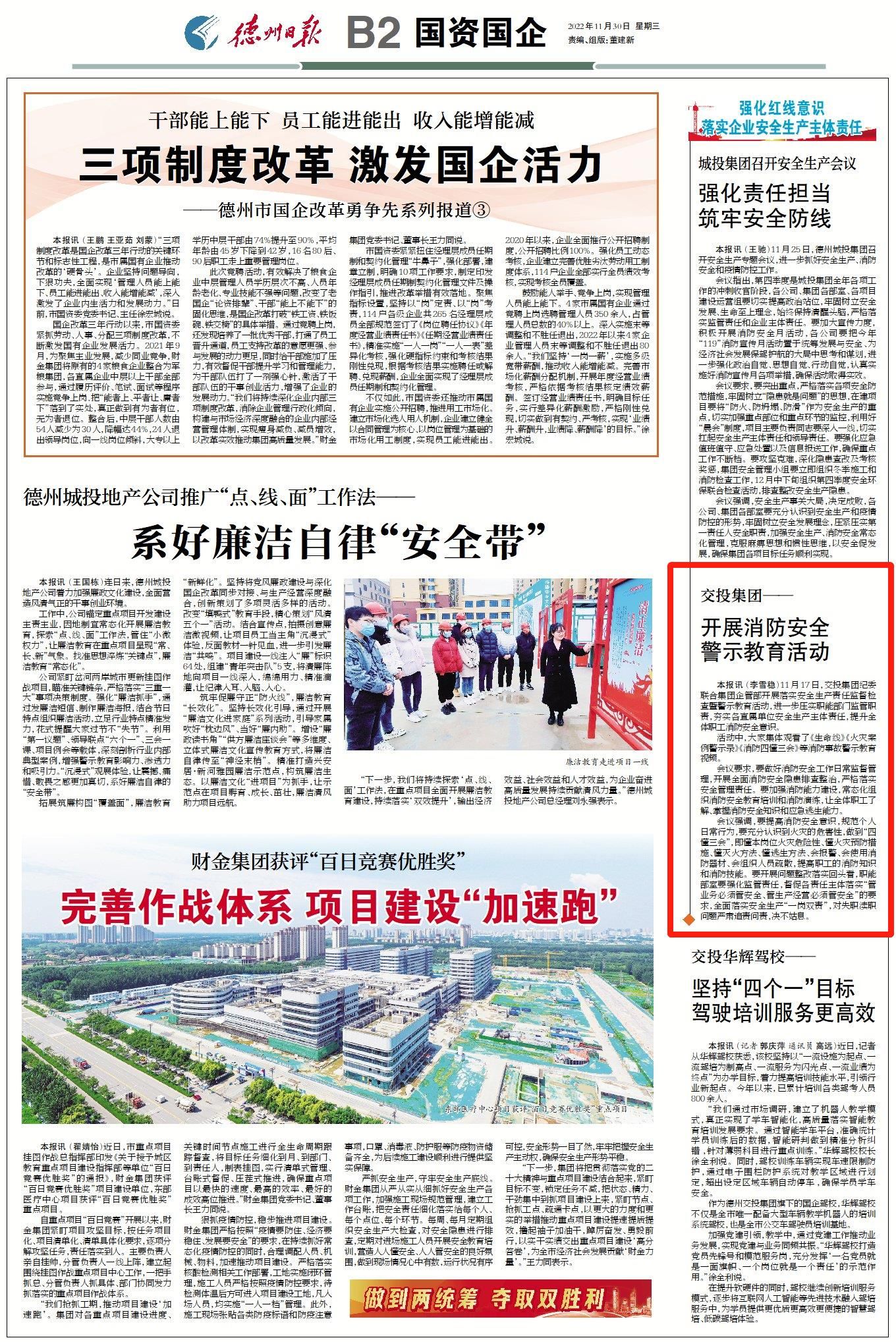 11月17日,交投集团纪委联合集团企管部开展落实安全生产责任监督检查暨警示教育活动,进一步压实职能部门监管职责,夯实各直属单位安全生产主体责任,提升全体职工消防安全意识。