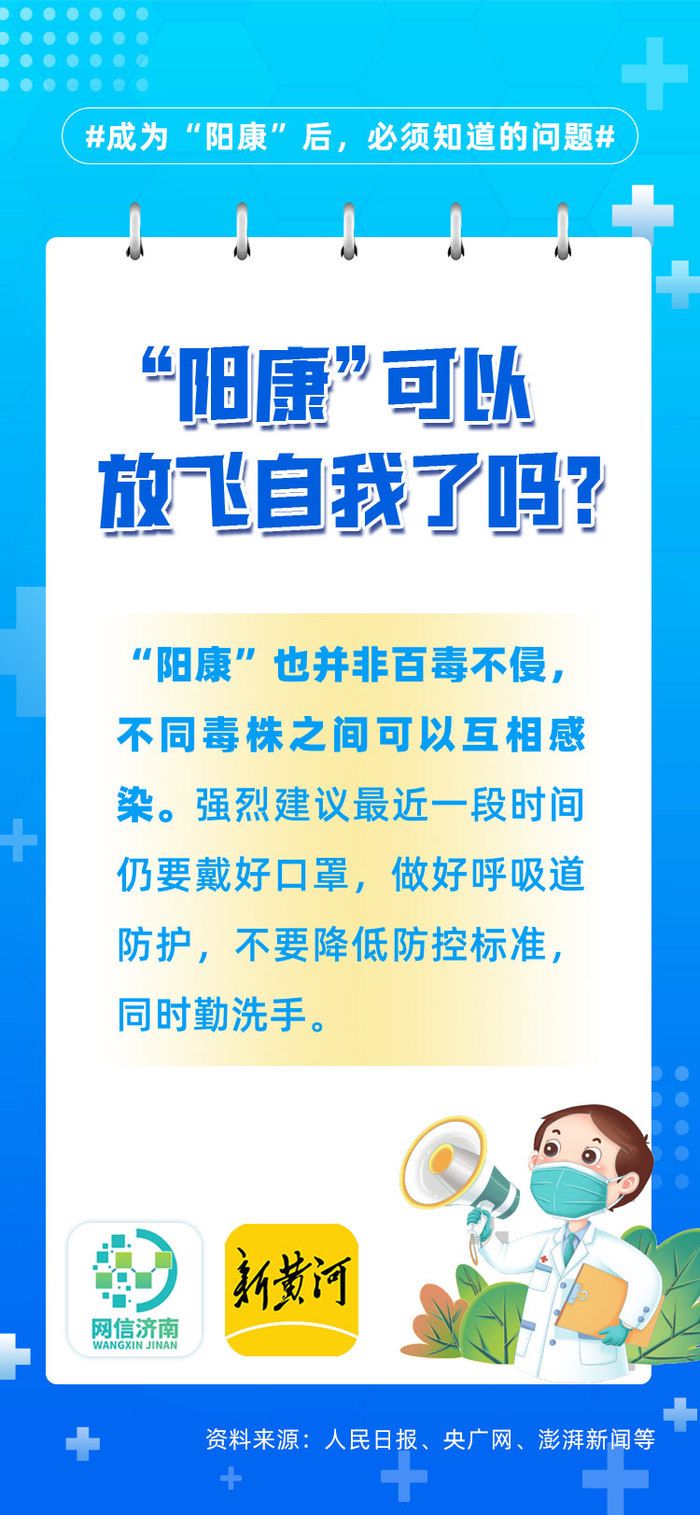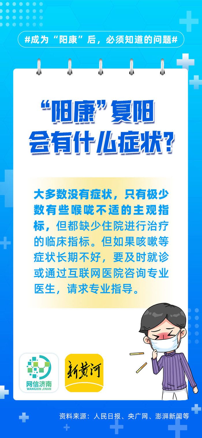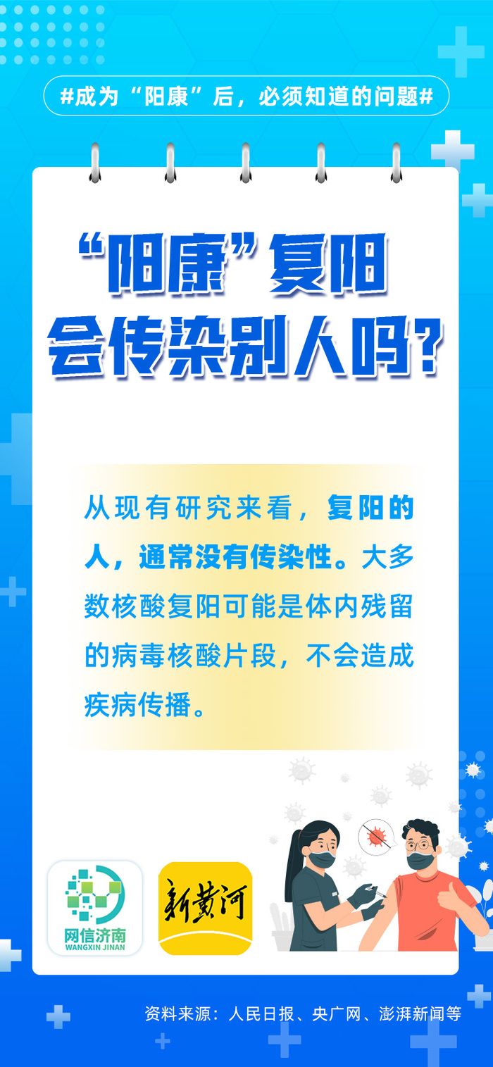 新黄河海报集|转阴后又复阳了?成为“阳康”后,这些问题必须知道! 2022-12-18 11:15 新黄河 0 “转阴三天后又复阳”“不到一周的时间,抗原转阴后又阳了”……最近,关于“阳康”复阳的话题,在网上热议。复阳是因为没完全康复吗?“阳康”复阳会传染别人吗?“阳康”就能放飞自我了吗?