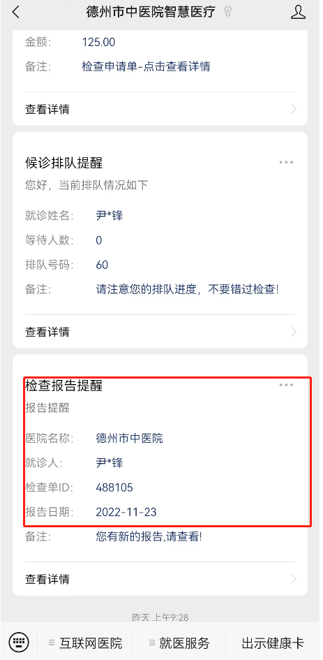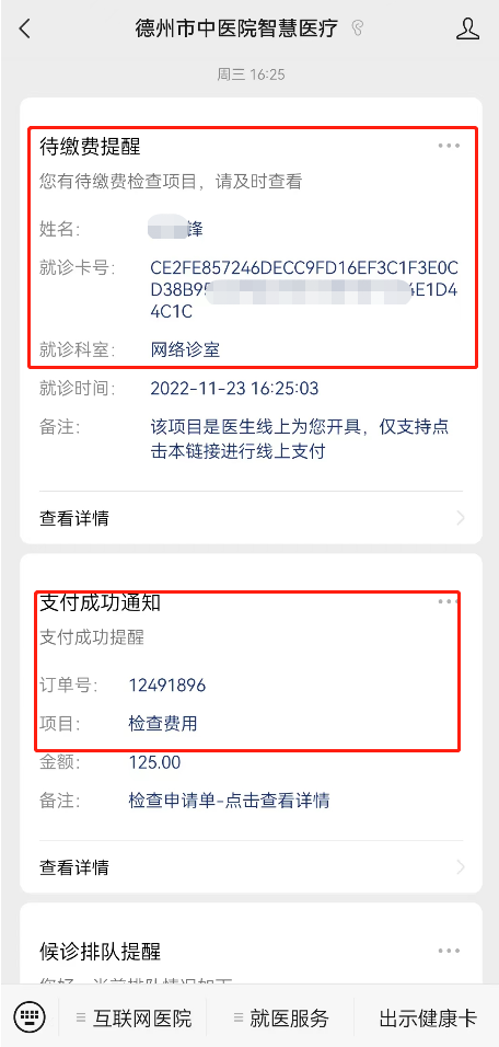 与患者沟通后,接诊医生为有需求的患者开具处方或检验检查,点击“待缴费提醒”进行支付,支付后凭健康卡二维码到院内相应科室做检验检查或取药,等待报告结果审核后,在与医生交流即可。