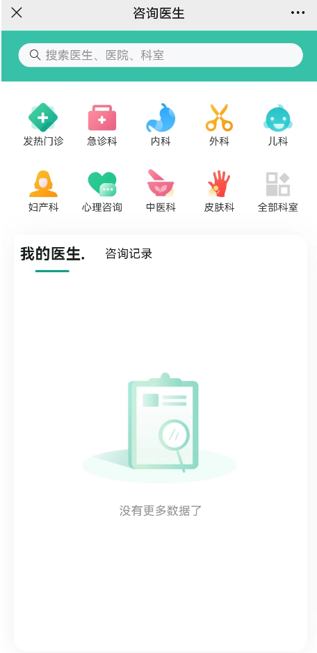 点击“互联网医院→咨询医生”,进入线上问诊平台,选择就诊科室或搜索医生,找到想要咨询的医生。
