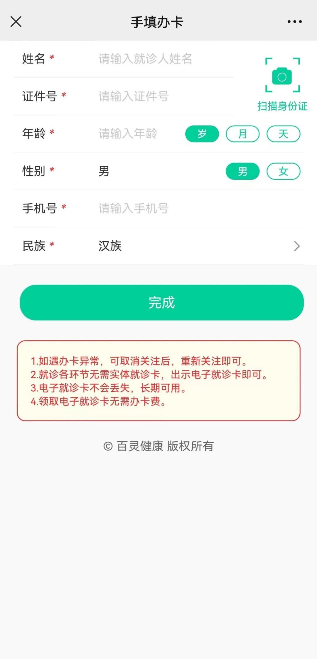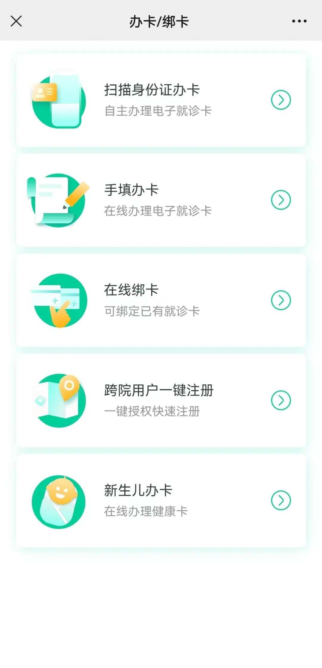 未到医院就诊过的患者可通过“扫描办卡”“手填办卡”,填写个人信息办理;就诊过的患者可直接绑定已有的就诊卡。