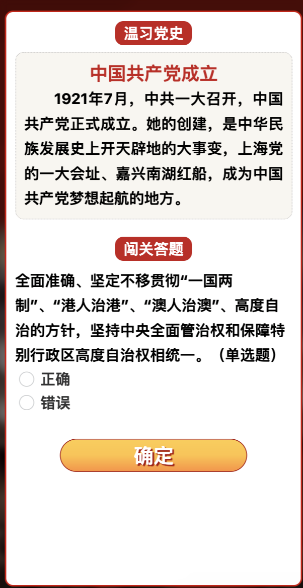 从党的一大到二十大,从嘉兴南湖红船到北京人民大会堂,中国共产党带领全国人民筚路蓝缕、艰苦奋斗,取得了一个又一个伟大胜利。闯关比赛沿着这一发展历程,结合党的二十大精神学习要点,设立了60个节点,每个节点都可温习一段党史知识,在其中30个节点设立了学习党的二十大精神答题闯关环节,旨在帮助参与者温故知新、悟深悟透党的二十大精神。