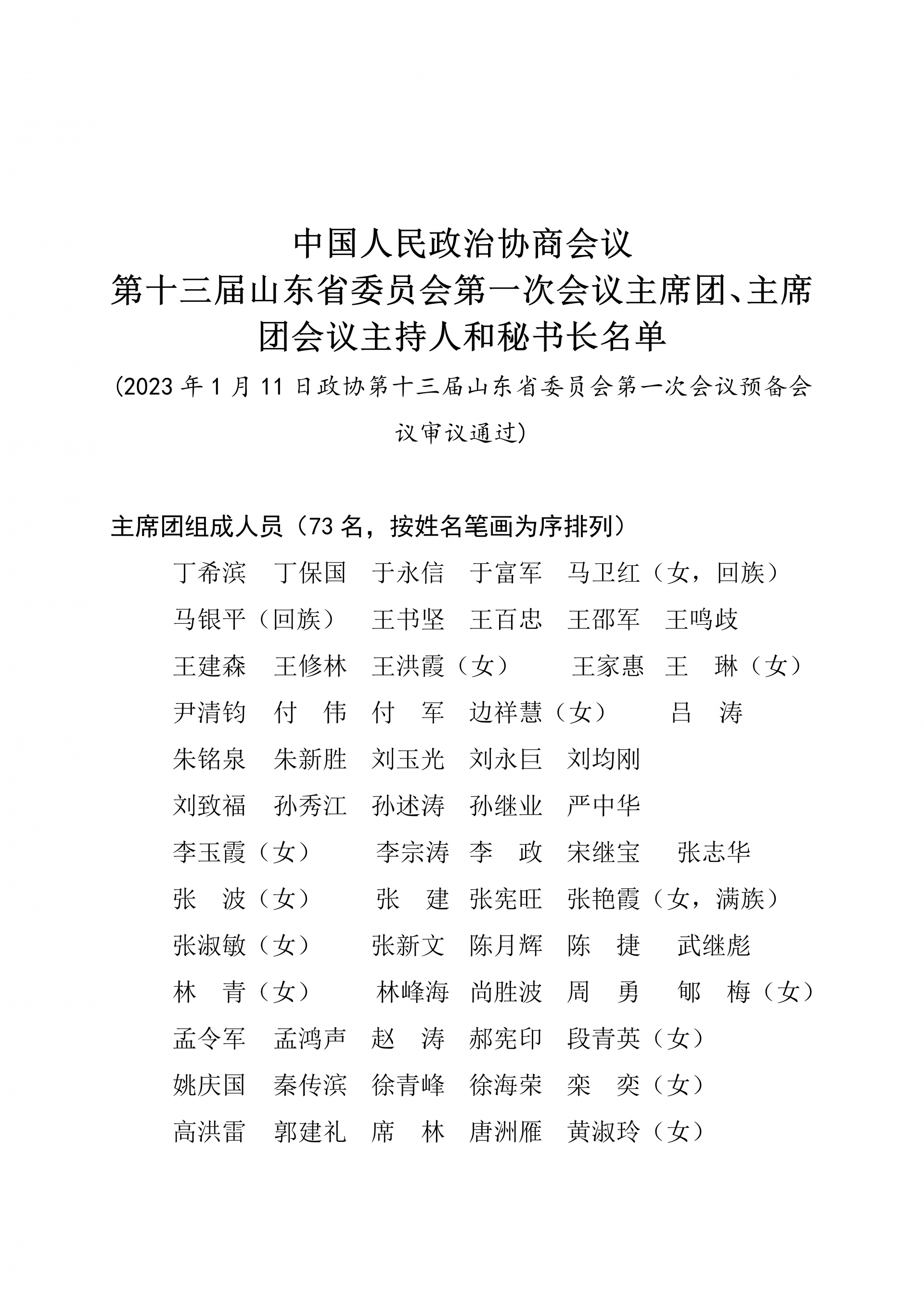 中国人民政治协商会议第十三届山东省委员会第一次会议主席团、主席团会议主持人和秘书长名单 2023-01-11 19:10 大众日报 0 德州日报新媒体出品来源|大众日报 编辑|王琳审核|张晓航 终审|朱代军