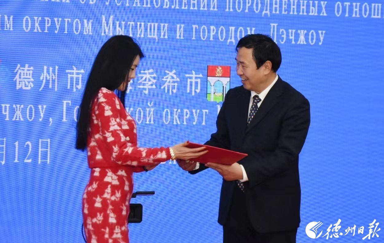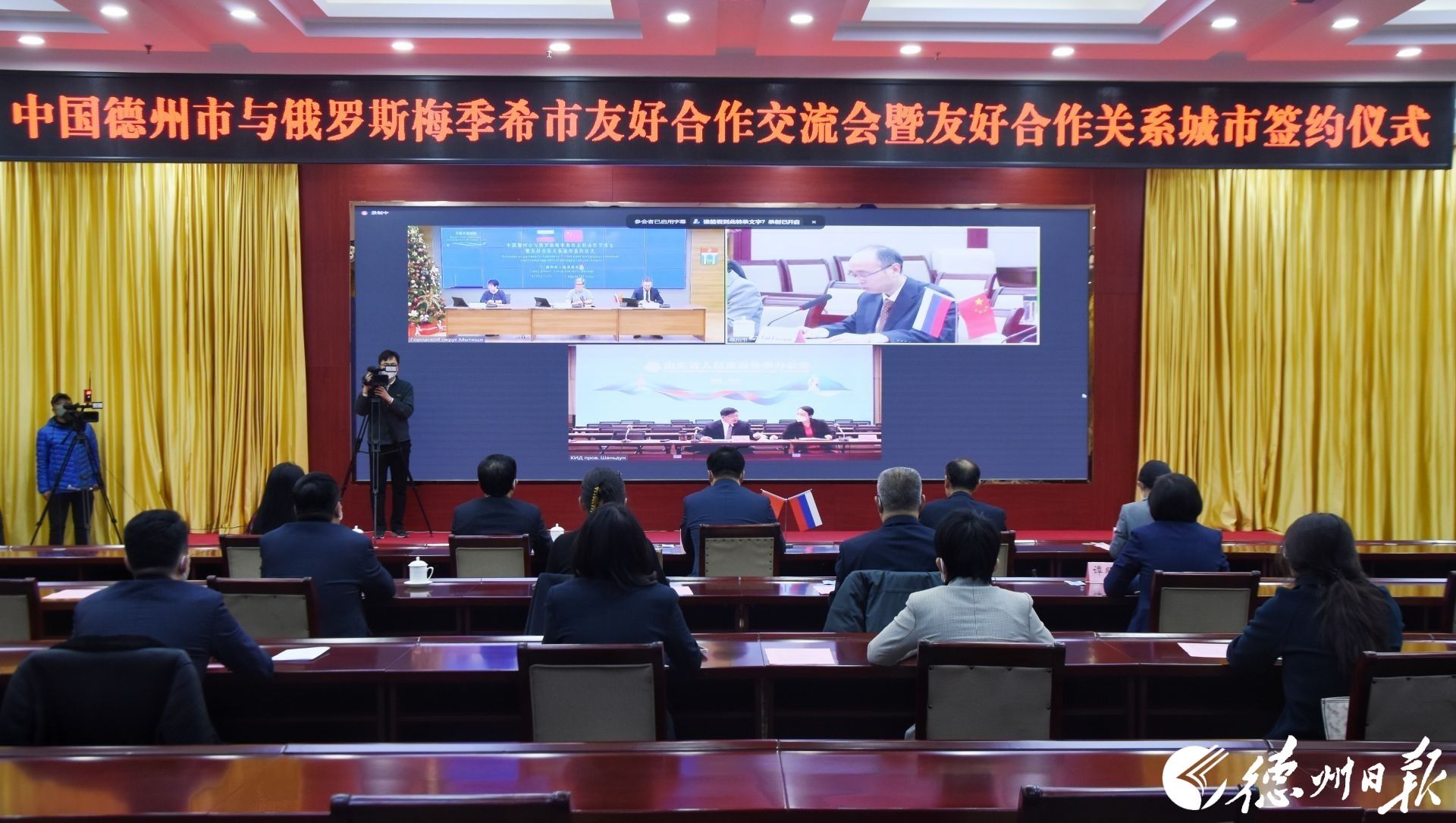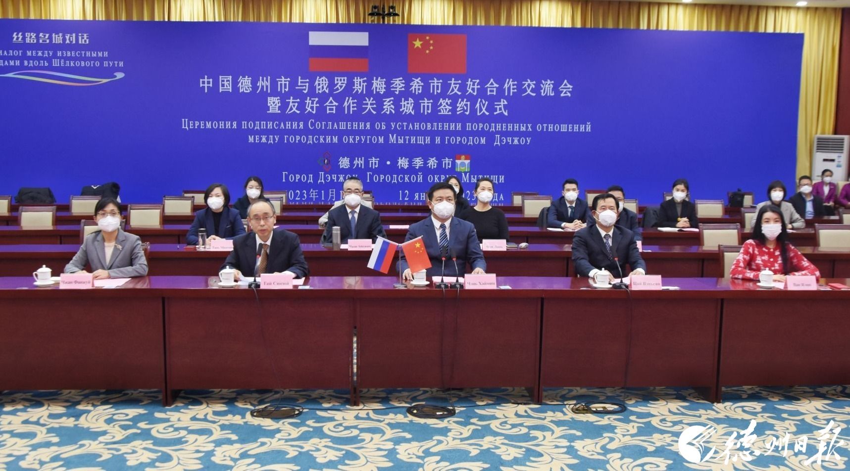 1月12日,丝路名城对话——德州市与俄罗斯梅季希市友好合作交流会暨友好合作关系城市签约仪式举行。副市长陈海明、梅季希市第一副市长伊万诺娃先后致辞并代表双方签署友好合作关系城市协议书。