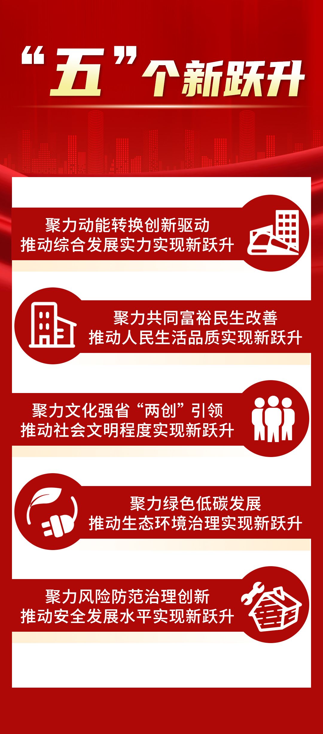 从强省内涵上分解,报告与省第十二次党代会相衔接,聚焦“强富高优美”,提出推动实现“五个新跃升”:聚力动能转换创新驱动,推动综合发展实力实现新跃升;聚力共同富裕民生改善,推动人民生活品质实现新跃升;聚力文化强省“两创”引领,推动社会文明程度实现新跃升;聚力绿色低碳发展,推动生态环境治理实现新跃升;聚力风险防范治理创新,推动安全发展水平实现新跃升。