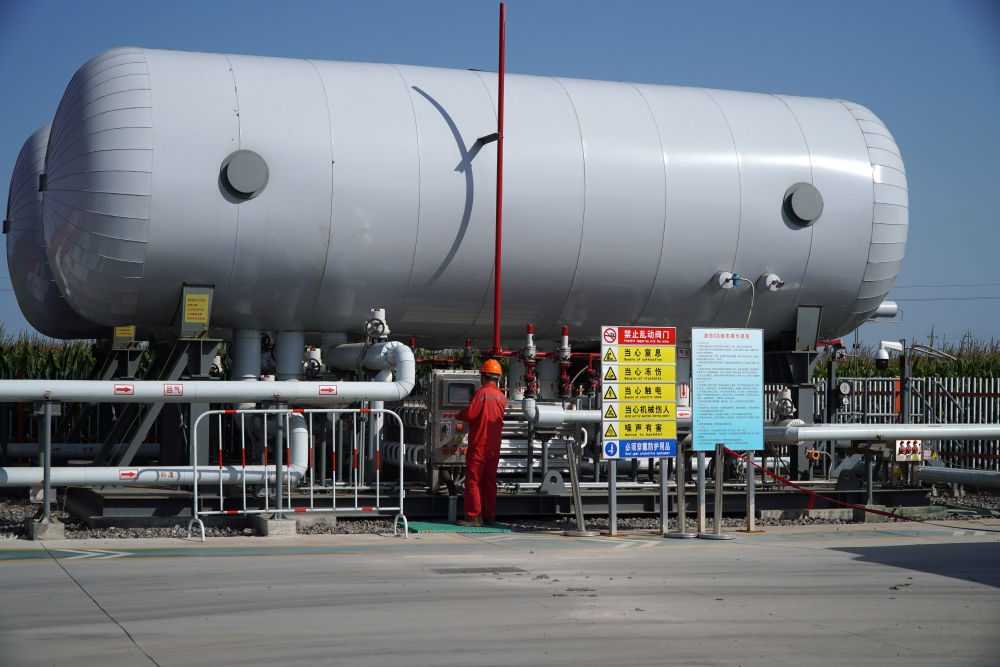 齐鲁石化—胜利油田百万吨级碳捕集、利用与封存项目10号注气站,一名工作人员在检查设备。记者 徐速绘 摄