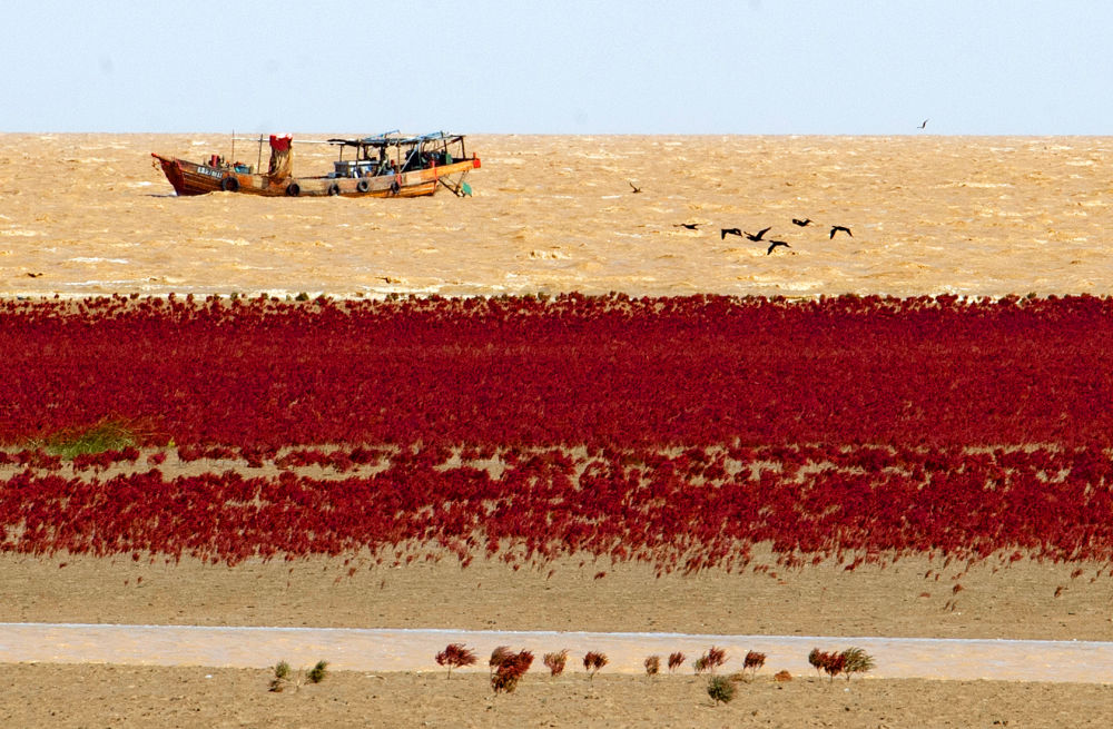 翅碱蓬给黄河口滨海滩涂湿地铺上“红地毯”。记者 范长国 摄