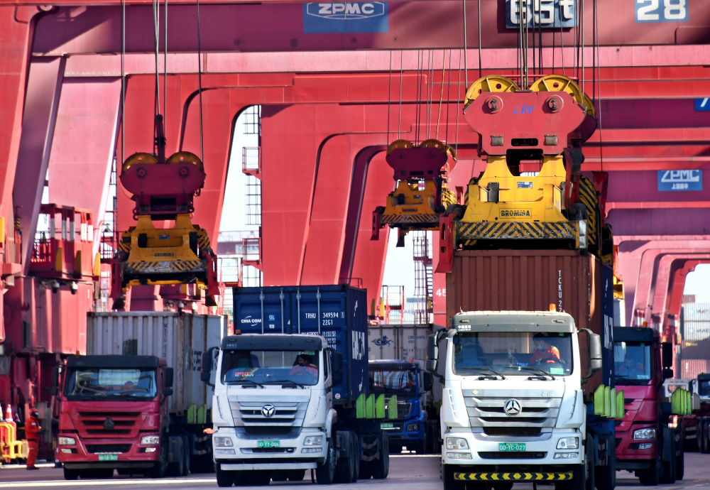青岛港前湾集装箱码头的繁忙景象。记者 李紫恒 摄