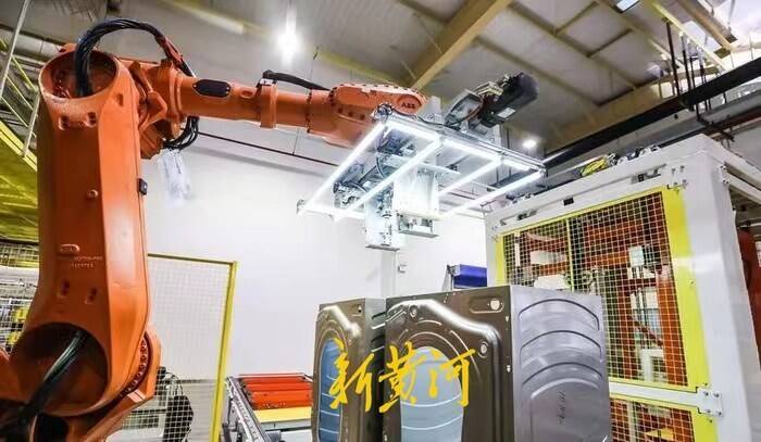 在青岛海尔洗衣机互联工厂,机器人正在作业。