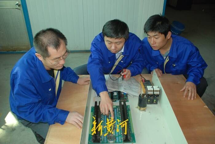 全国人大代表胡淑娥(中)与同事探讨技术问题