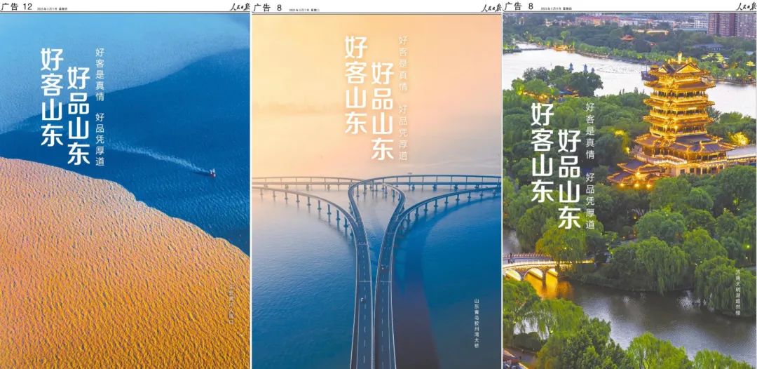在人民日报推介“好客山东 好品山东”的海报中,济南大明湖超然楼,以网红姿态尽展齐鲁雄厚文化底蕴;青岛胶州湾跨海大桥,以宏伟造型彰显雄厚科技实力;东营黄河入海口,以蓝黄交汇展现山东壮丽自然景观。