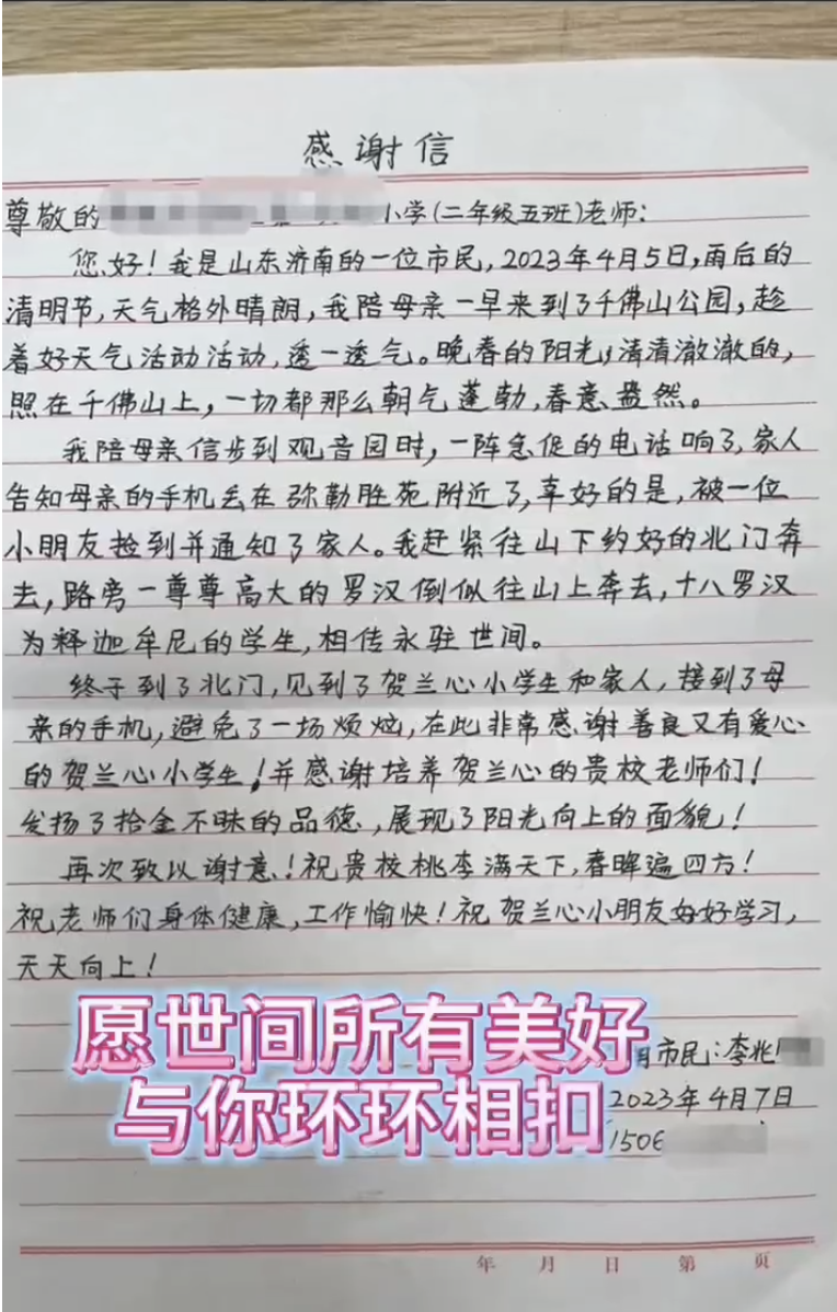 孩子的学校意外收到一封手写的感谢信,感谢孩子拾金不昧,网友:这是对孩子一生的鼓励。