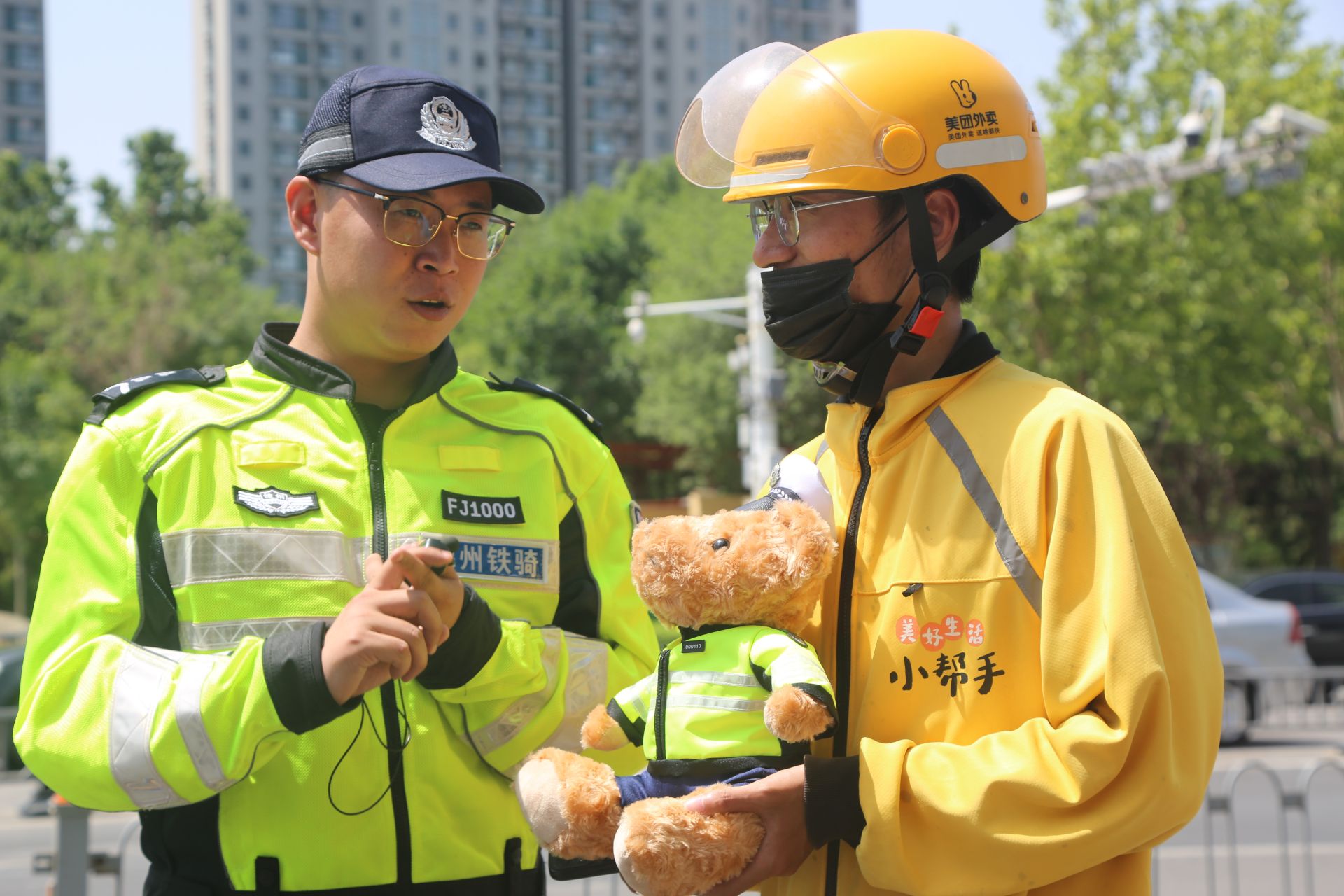 6月1日早上,在湖滨路与东风路交叉口,一位外卖小哥在通过斑马线时很自觉地下车推行。这一幕被市公安局交警支队直属一大队民警发现。他们立即上前,为他送上了一只“交警小熊”作为鼓励。“很意外,没想到这么一个小小的举动还会获得礼物。小熊实在太可爱了,我这个‘大朋友’也幸运地过上了儿童节。”外卖小哥表示,这是一种肯定,他将继续坚持文明安全送餐,用自己的实际行动影响身边人。