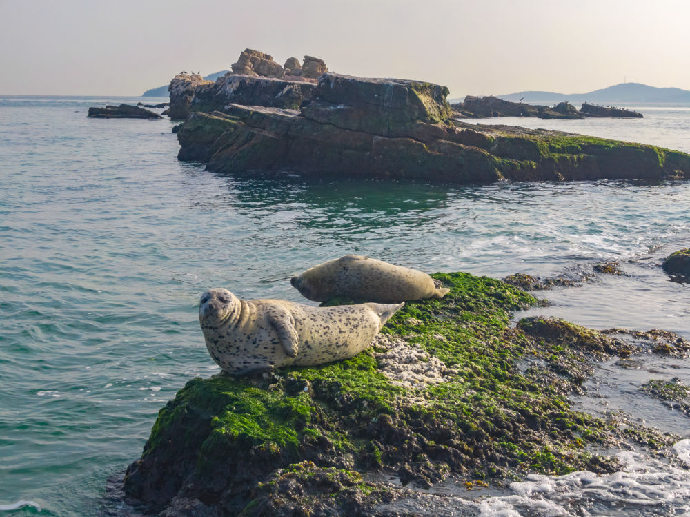 在长岛海域,斑海豹在礁石上休憩(无人机照片)。新华社发(张维康 摄)