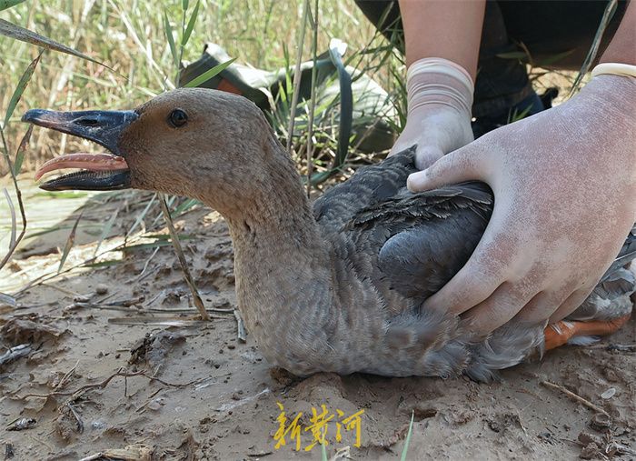 14日中午,新黄河记者跟随张树岩前往一万七千亩湿地恢复区巡护,在沿岸的芦苇荡边,张树岩意外发现一只受伤的豆雁,他与车纯广、刘彦进合力救下了它。“这是一处硬伤,受伤时间不长,情况不太乐观,因为它已经不会飞了。”他说,13日下午这片区域下了冰雹,这只亚成体的豆雁可能是在那时受的伤。“接下来我们会把它带到站里的救助中心,进行检查和治疗,等它全面恢复以后,把他放归大自然。”