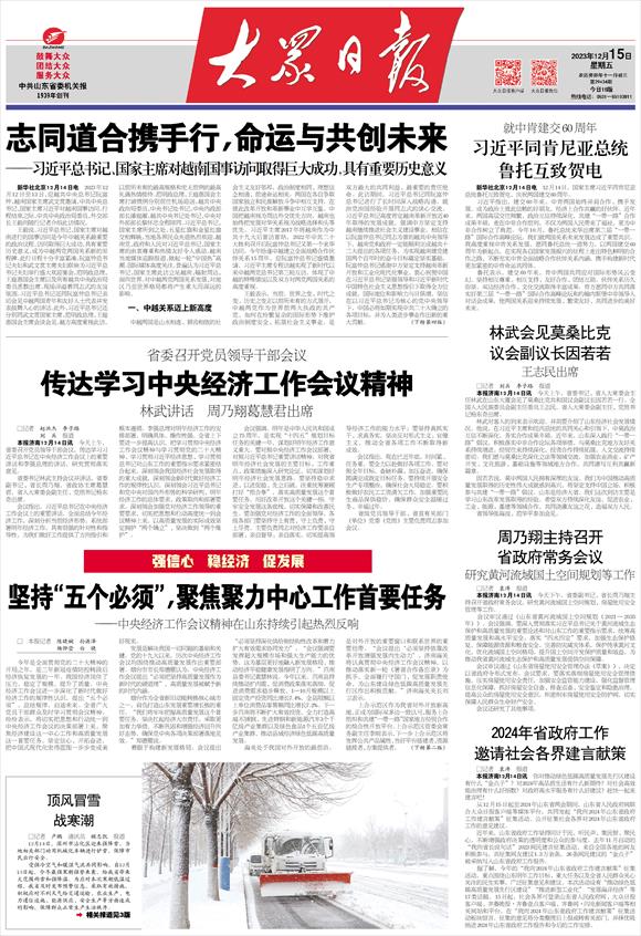 今年是全面贯彻党的二十大精神的开局之年,是三年新冠疫情防控转段后经济恢复发展的一年。我国经济顶住了压力,稳定了规模,提升了质量。中央经济工作会议进一步深化了新时代做好经济工作的规律性认识,提出“五个必须”,总结规律,启迪未来。全省广大党员干部群众及时学习贯彻会议精神,纷纷表示,将切实把思想和行动统一到中央经济工作会议的决策部署上来,聚焦经济建设这一中心工作和高质量发展这一首要任务,坚定信心、开拓奋进,把中国式现代化宏伟蓝图一步步变成美好现实。