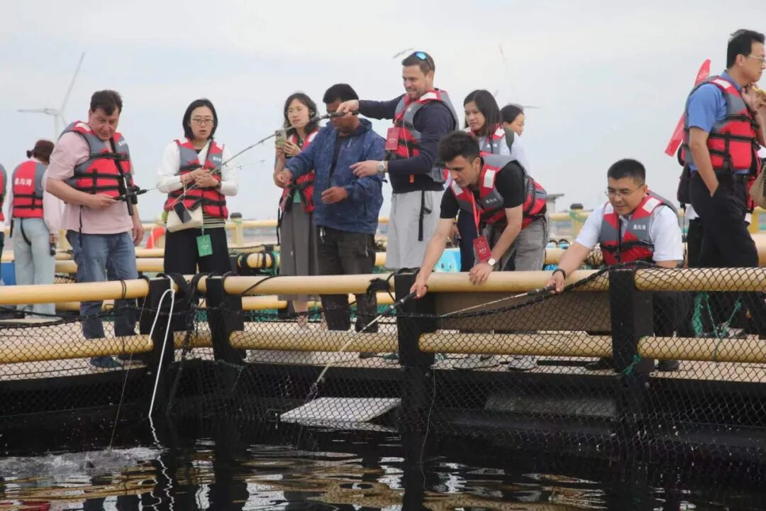 离开东楮岛村,采访团一行前往桑沟湾国家级海洋牧场,这里有着北方最大规模的海上网箱养殖群。大家在码头乘坐游船,一路乘风破浪,来到浮动的生态旅游观光平台,零距离体验海上观光、与海洋生物互动的乐趣。这里还有全国最大的海水河豚养殖场,河豚成为了“网红”,其憨态可掬的形象吸引采访团成员纷纷与其合影。碧海、蓝天、岛礁、木船、海耕、牧场,构成了桑沟湾自然天成与现代发展融合的美丽与魅力。