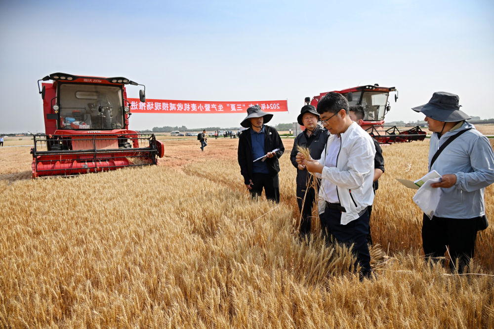 6月11日,工作人员在青岛西海岸新区大场镇陈家小庄村麦田里查看小麦收获情况。