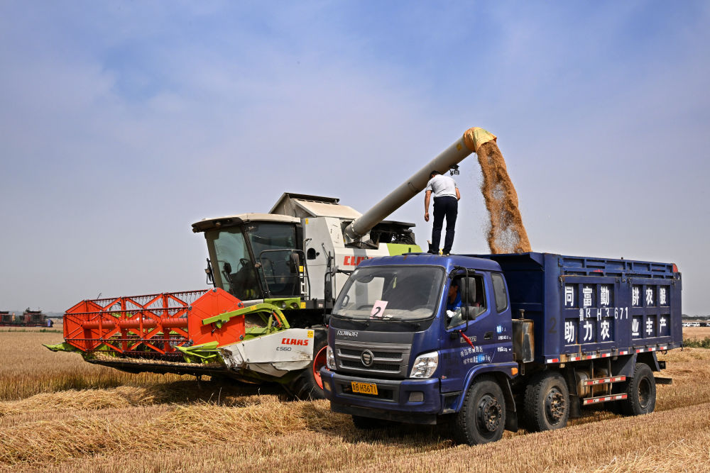 6月11日,收割机在青岛西海岸新区大场镇陈家小庄村麦田里进行机收作业。