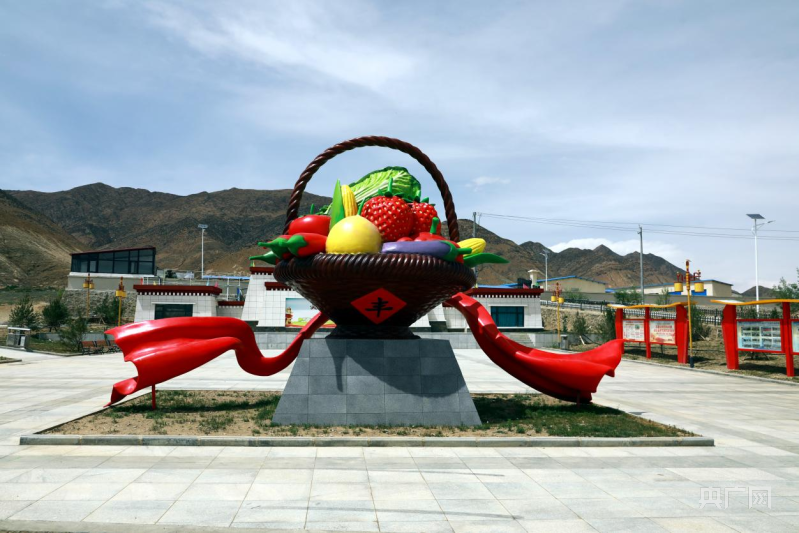 蔬菜篮雕塑立在阿亚村口(央广网记者 唐磊 摄)