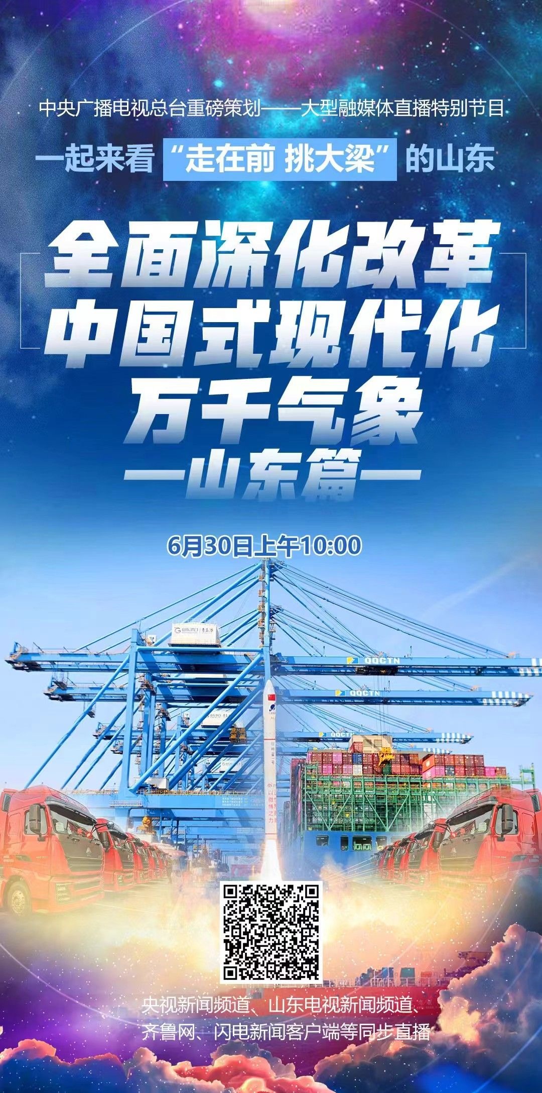 《全面深化改革 中国式现代化万千气象》山东篇直播特别节目 2024-06-30 09:45 闪电新闻 0 点击图片观看直播 党的十八大以来,习近平总书记先后六次视察山东,对山东全面深化改革寄予厚望,为山东改革发展指明方向。走在前,挑大梁,新时代的山东如何做实改革文章,彰显山东担当?6月30日上午十点,央视新闻频道特别奉献《全面深化改革 中国式现代化万千气象. 山东篇》。山东电视新闻频道、齐鲁网、闪电新闻客户端同步直播。 德州日报新媒体出品来源|闪电新闻 编辑|密霖审核|张晓航 终审|朱代军
