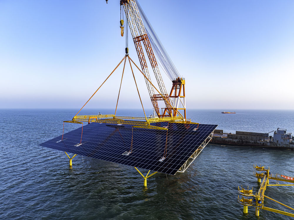 在东营市垦利区离岸8公里的一片海域,中国建筑第八工程局有限公司技术工人正在进行光伏平台吊装施工。新华社发(受访者供图)