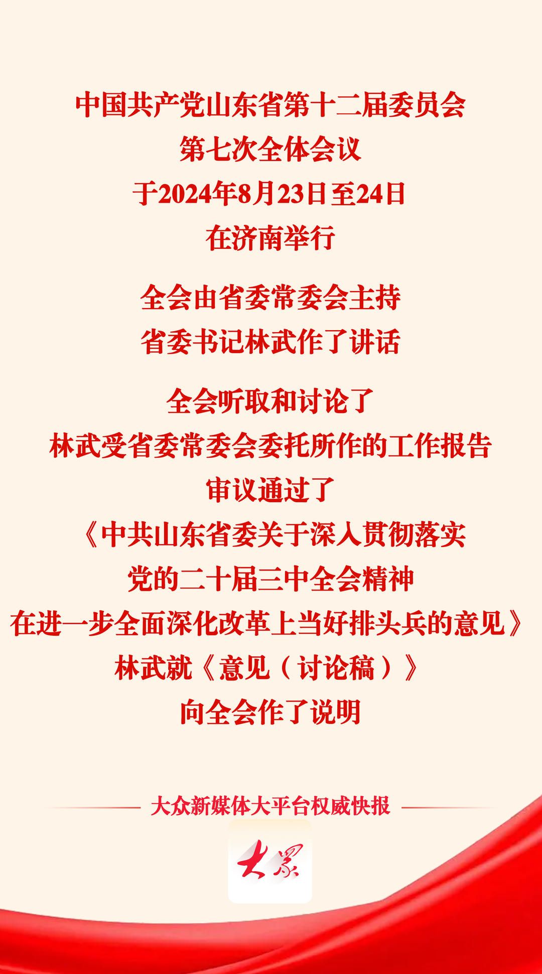 权威快报|在进一步全面深化改革上当好排头兵!山东省委全会通过重磅《意见》 2024-08-24 13:16 大众新闻 0 8月23日至24日,中国共产党山东省第十二届委员会第七次全体会议在济南举行。全会听取和讨论了省委常委会工作报告,审议通过了《中共山东省委关于深入贯彻落实党的二十届三中全会精神在进一步全面深化改革上当好排头兵的意见》。