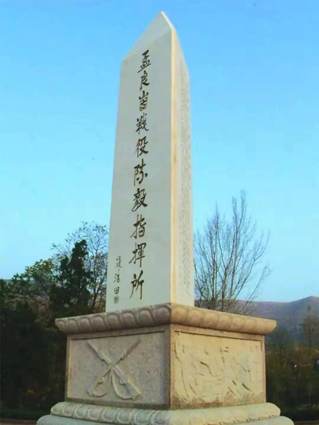 陈毅元帅的这首七言律诗道出了孟良崮战役人民必胜、美蒋必败的英豪气概。现在,当我们来到沂水县沂蒙山区根据地旅游区双山村(王庄西南2华里),远远就望见矗立在村东孟良崮战役陈毅指挥所纪念碑。纪念碑的基座为方形,四面分别雕刻了枪枝造型和解放军战士冲锋陷阵的英雄群像。碑身用汉白玉石料、三棱刺刀造型,挺拔锋利,直插云霄。纪念碑正面由中央军委原副主席兼国防部长迟浩田上将题写的"孟良崮战役陈毅指挥所"十个金色大字熠熠生辉。纪念碑右侧有一条沟,顺石阶而下迎沟北上不远处便是当年陈毅元帅指挥孟良崮战役的所在地。