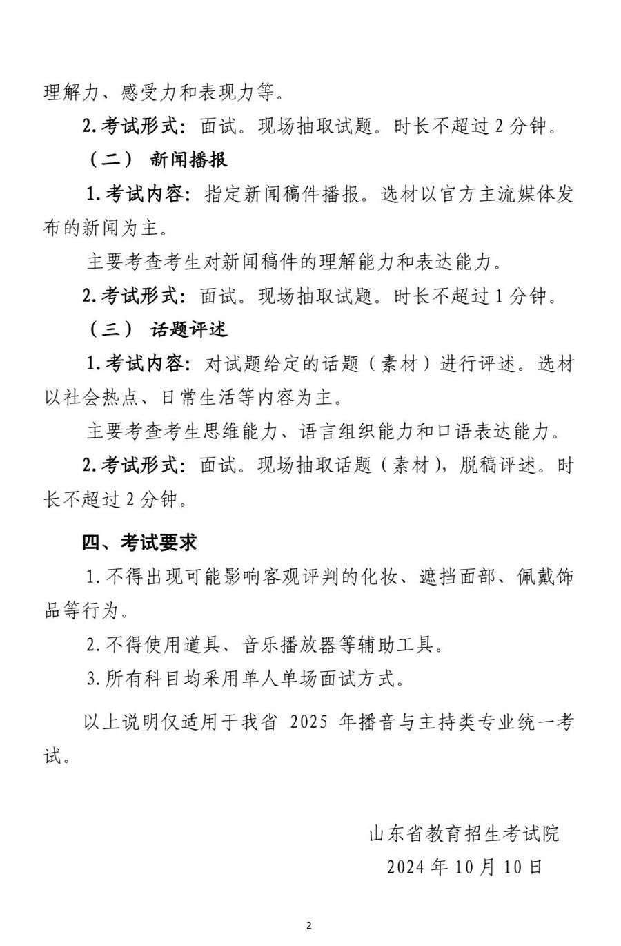 根据国家统一部署要求,2025年我省普通高校招生艺术类专业中的美术与设计类、书法类、舞蹈类、音乐类、播音与主持类和表(导)演类专业实行省级统一考试。其中,美术与设计类、书法类专业采取笔试形式,音乐类专业采取笔试+现场录制形式,表(导)演类(戏剧影视导演方向)专业采取笔试+现场面试形式,舞蹈类、播音与主持类、表(导)演类(戏剧影视表演、服装表演方向)专业采取现场面试形式。