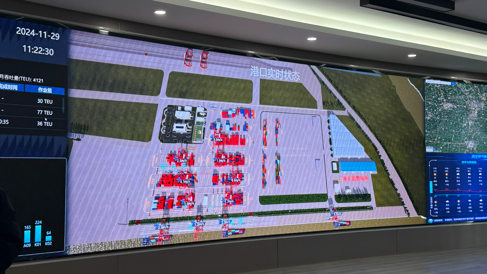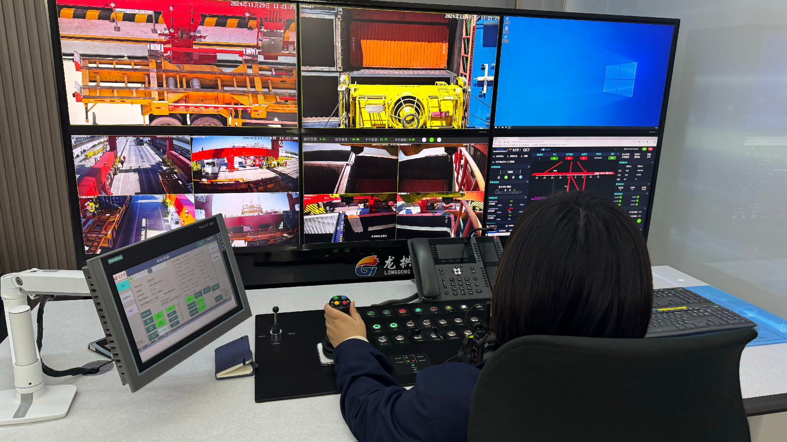 在龙拱港堆场内,几乎很少看到工作人员的身影。一辆辆无人水平运输车精准地装载着集装箱,平稳地驶向码头。自动吊装设备将集装箱稳稳当当地安置在货船上,操作员只需坐在远程控制中心,在屏幕前操纵手柄,就能进行远程操控。