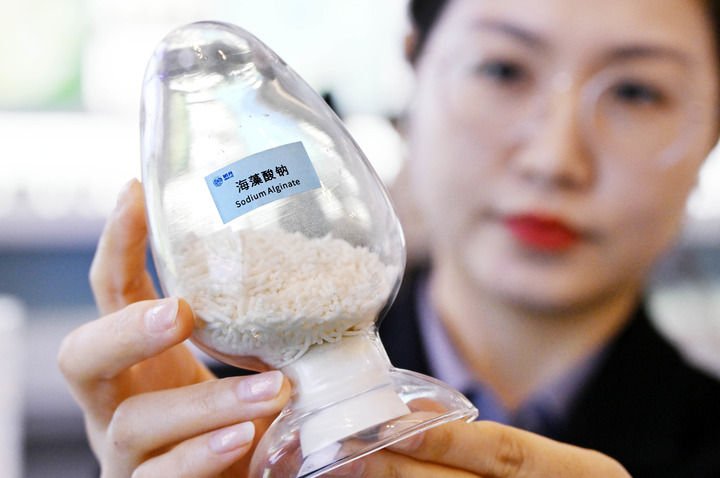 在明月海藻集团的海藻科技馆内,一小瓶白色粉末看似不起眼,却是企业的核心技术产品——超纯海藻酸钠。