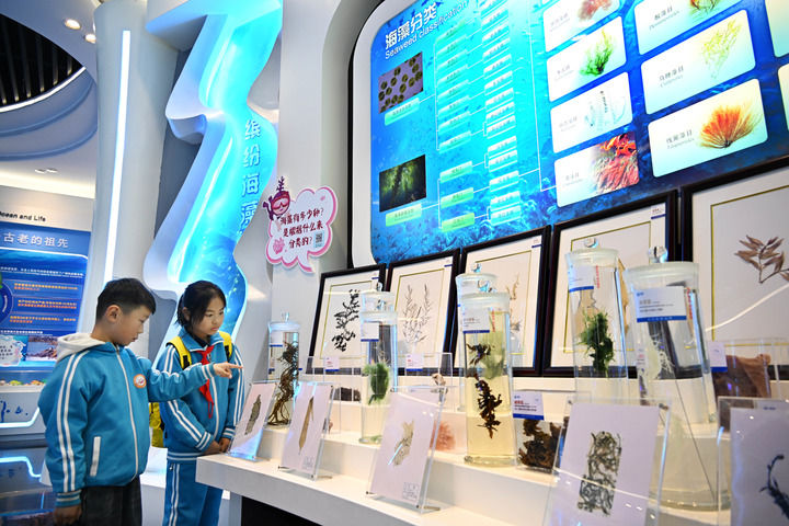 两名小学生在明月海藻集团海藻科技馆内参观(11月14日摄)。新华社记者 李紫恒 摄