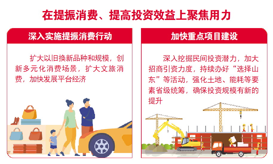 12月24日至25日,省委十二届八次全会暨省委经济工作会议在济南举行,总结2024年全省经济工作,分析当前经济形势,部署2025年经济工作。会议提出要重点在十个方面聚焦用力,既利当前、更利长远。其中“在提振消费、提高投资效益上聚焦用力”被放在首位,进一步彰显了扩大内需的鲜明导向。一项项实实在在的举措,将如何点燃消费、投资“双引擎”,打出扩大内需组合拳?本报与省委财经办、有关单位及专家学者深入沟通,解读明年工作的发力点。