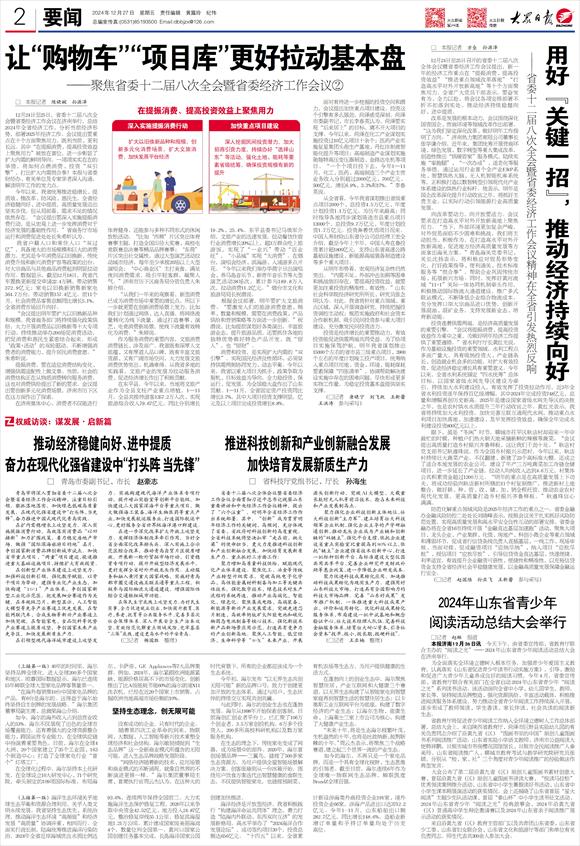 12月24日至25日,省委十二届八次全会暨省委经济工作会议在济南举行,总结2024年全省经济工作,分析当前经济形势,部署2025年经济工作。会议提出要重点在十个方面聚焦用力,既利当前、更利长远。其中“在提振消费、提高投资效益上聚焦用力”被放在首位,进一步彰显了扩大内需的鲜明导向。一项项实实在在的举措,将如何点燃消费、投资“双引擎”,打出扩大内需组合拳?本报与省委财经办、有关单位及专家学者深入沟通,解读明年工作的发力点。